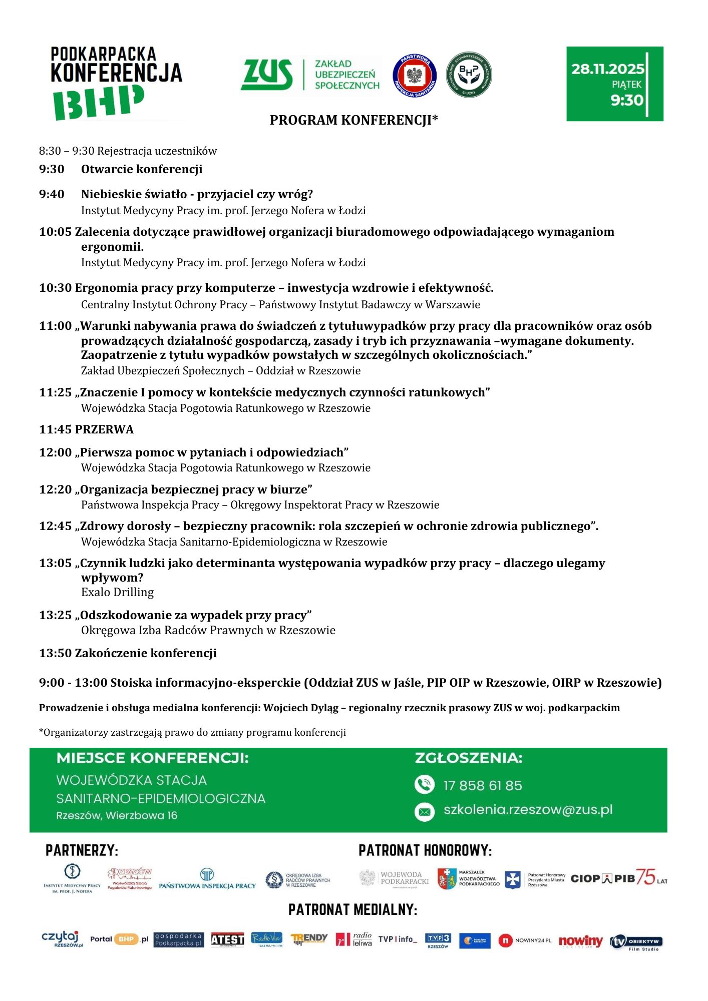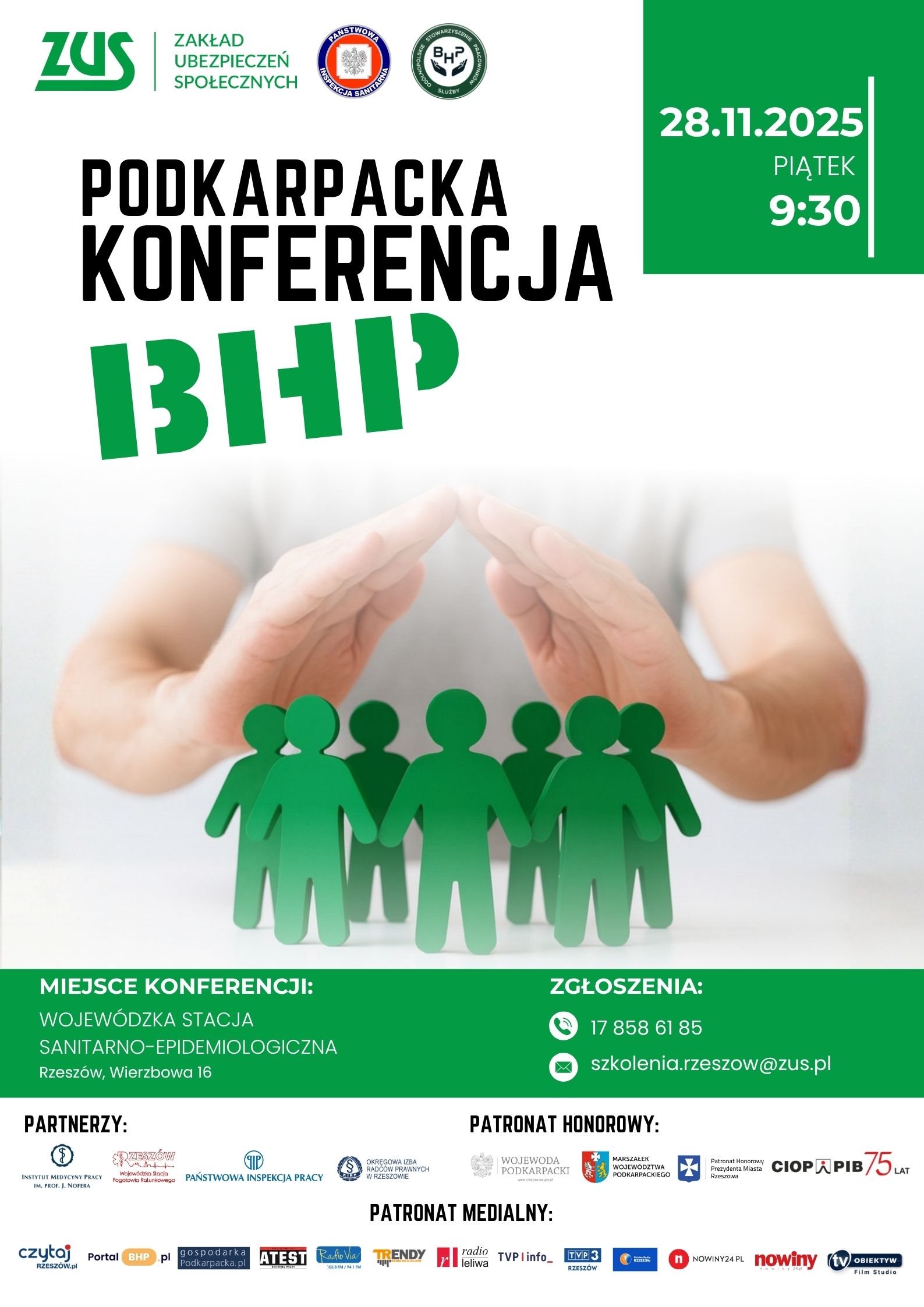 Event description PODKARPACKA KONFERENCJA BHP – Rzeszów, 28 listopada 2025 r. Oddział Zakładu Ubezpieczeń Społecznych w Jaśle i Rzeszowie przy współpracy z Wojewódzką Stacją Sanitarno – Epidemiologiczną w Rzeszowie oraz rzeszowskim oddziałem Ogólnopolskiego Stowarzyszenia Pracowników Służby BHP serdecznie zapraszają do udziału w pierwszej edycji PODKARPACKIEJ KONFERENCJI BHP. Konferencja odbędzie się ona 28 listopada 2025 roku od godz. 9:30 w Rzeszowie – ul. Wierzbowa 16. Z racji ograniczonej liczby miejsc prosimy o potwierdzanie uczestnictwa: