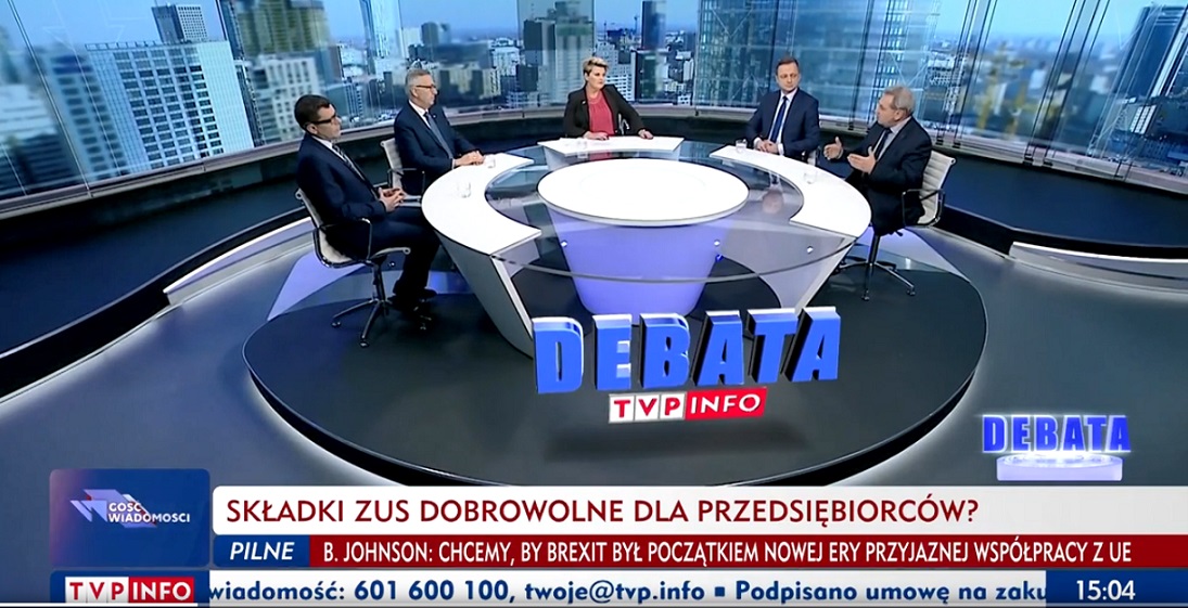 goście debaty - link do powiększonego zdjęcia Prezez ZUS Paweł Jaroszek podczas debaty TVP info - lik do powiększonego zdjęcia