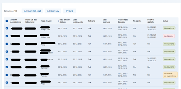 Na portalu eZUS udostępniliśmy możliwość pobrania dokumentów i danych dotyczących elektronicznych zwolnień lekarskich w postaci plików xml oraz w postaci plików csv.