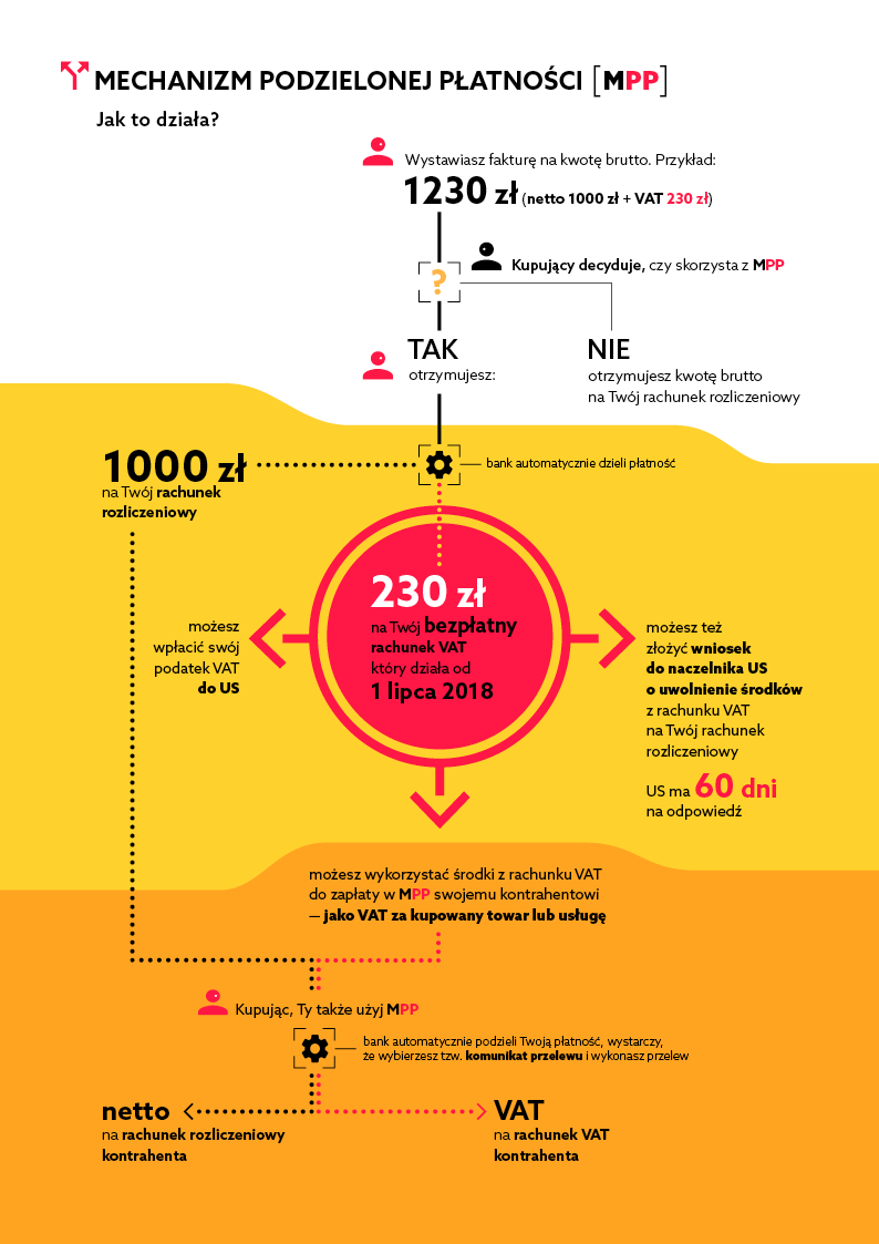 Mechanizm podzielonej płatności (MPP) to narzędzie, które zwiększy bezpieczeństwo przedsiębiorców oraz pomoże uszczelnić system podatkowy. Istotą mechanizmu jest podział płatności za nabyty towar lub usługę: kwota netto wynikająca z faktury jest płacona na rachunek rozliczeniowy dostawcy lub jest rozliczana w inny sposób, np. gotówką, natomiast kwota VAT jest płacona na dedykowany rachunek VAT.
