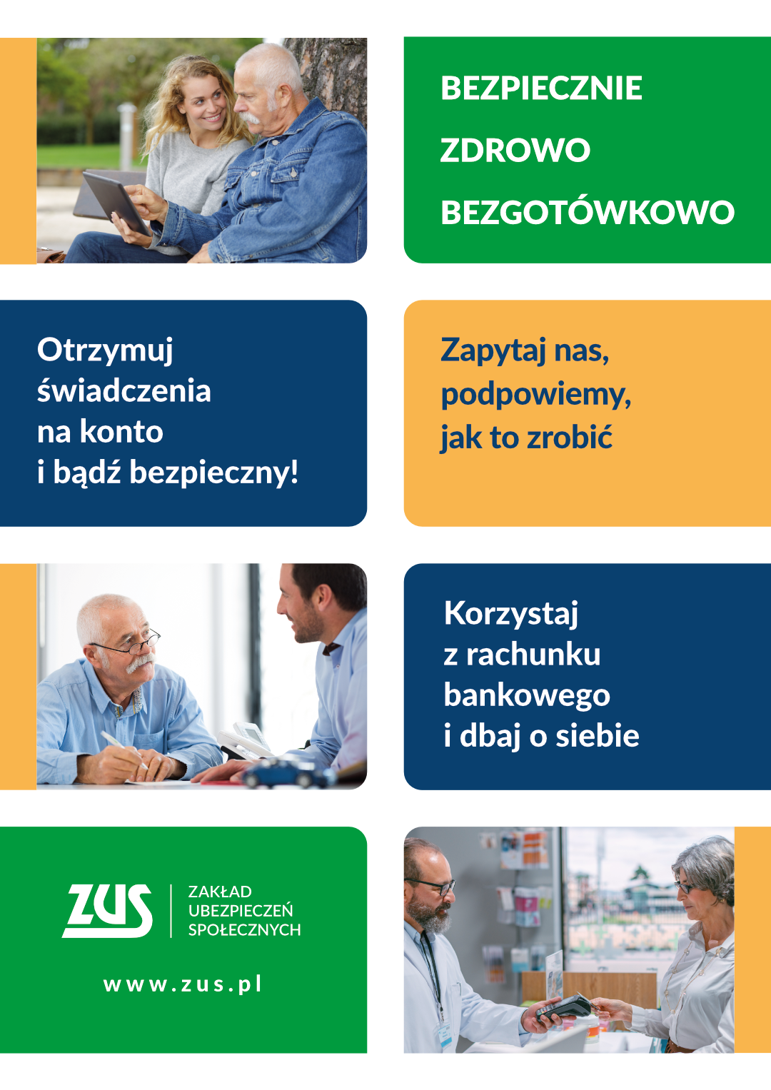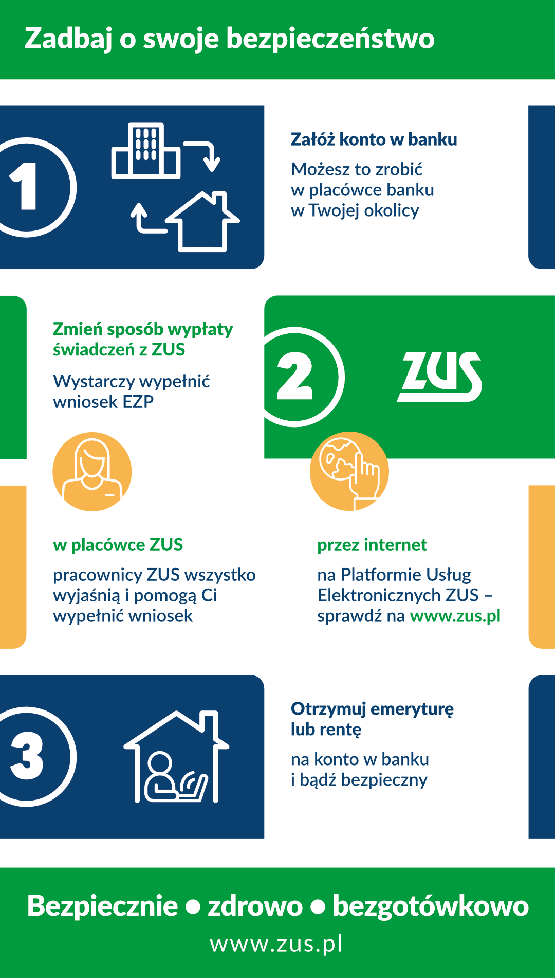 • pomóż i pokaż im, jak funkcjonować w cyfrowym świecie. Grafika przedstawia hasła kampanii Bezpiecznie, zdrowo bezgotówkowo, Korzystaj z rachunki bankowego, Pobieraj świadczenia z ZUS na konto - przekierowanie do powiększonej grafiki