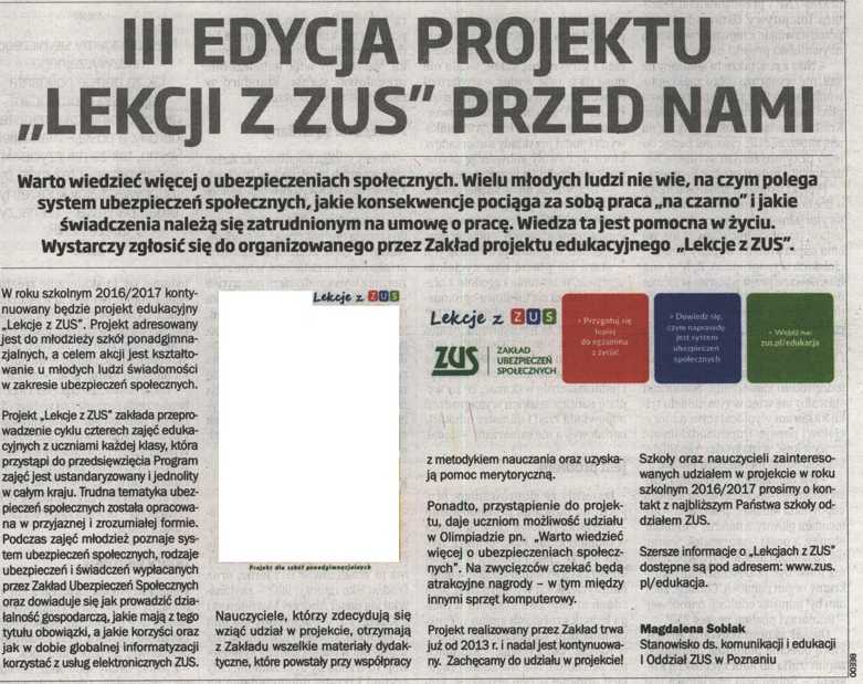 III edycja projektu "Lekcje z ZUS" przed nami - Głos Nauczycielski 26.09.2016 r.