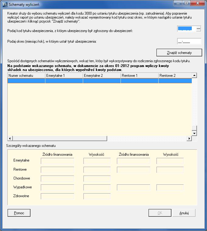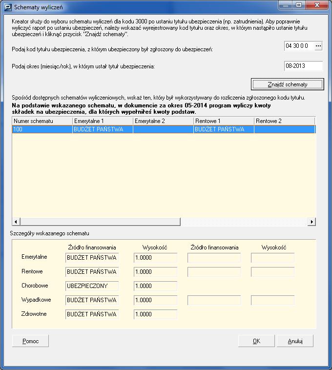 Najczęściej program wyświetli jeden schemat finansowania składek. Natomiast w sytuacji, gdy w danym okresie występowały dwa lub więcej możliwe do użycia schematy, należy wskazać właściwy.