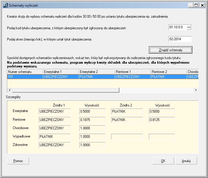Program wyświetli jeden schemat finansowania składek (numer 101). Zaakceptuj schemat klikając przycisk OK.