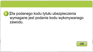 Jeżeli kod wykonywanego zawodu nie został podany, a jest wymagany ze względu na wybrany kod tytułu ubezpieczenia, prezentowany jest płatnikowi komunikat, mówiący o konieczności wypełnienia kodu wykonywanego zawodu: